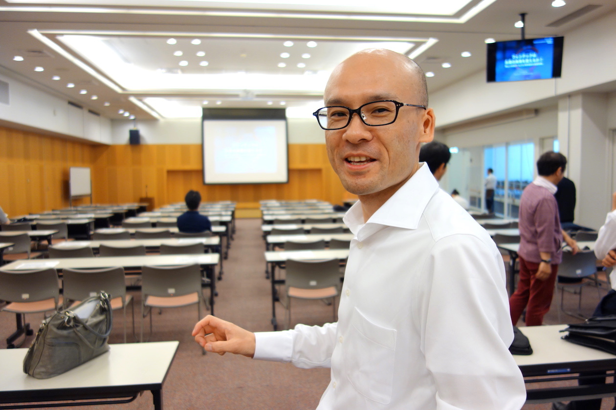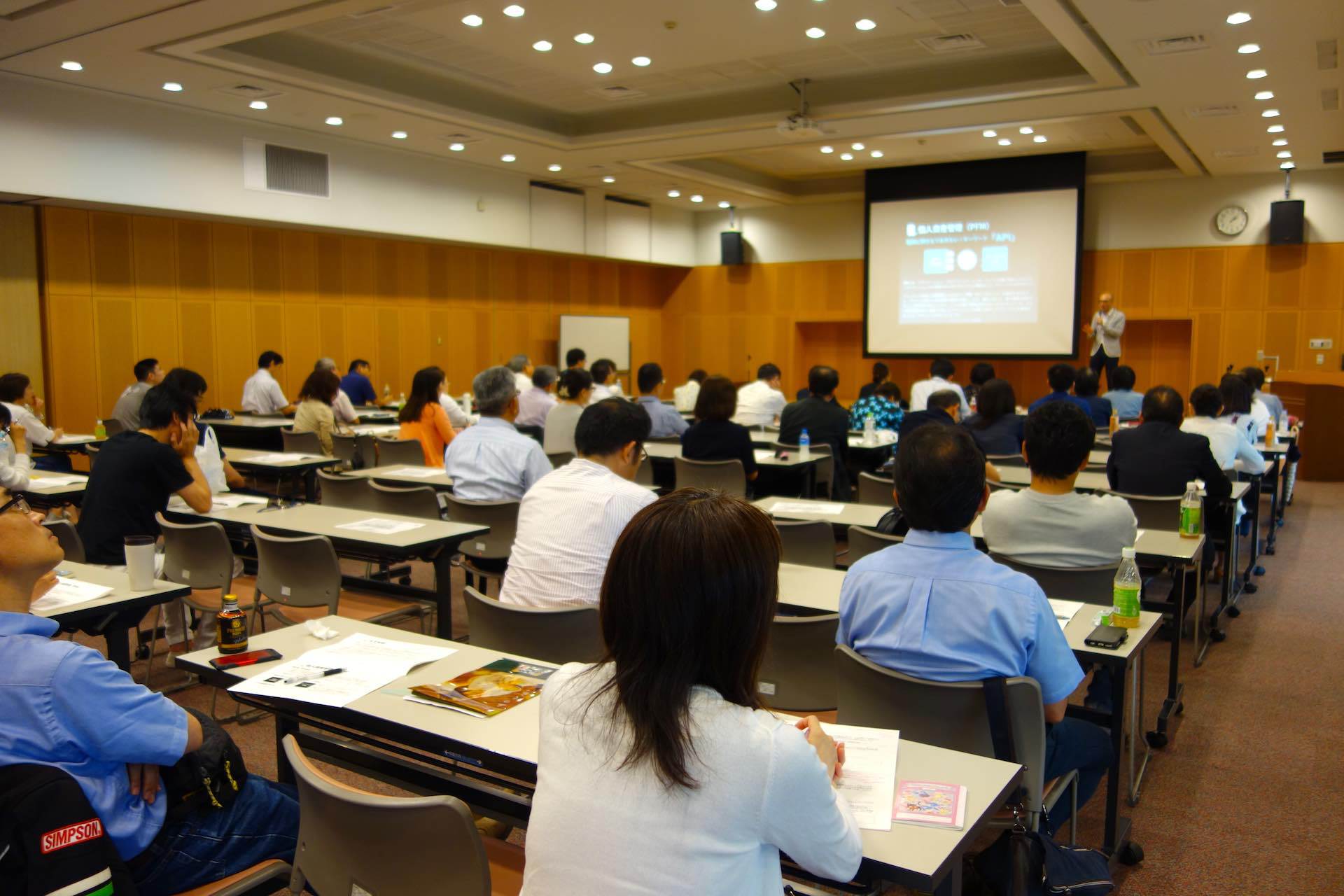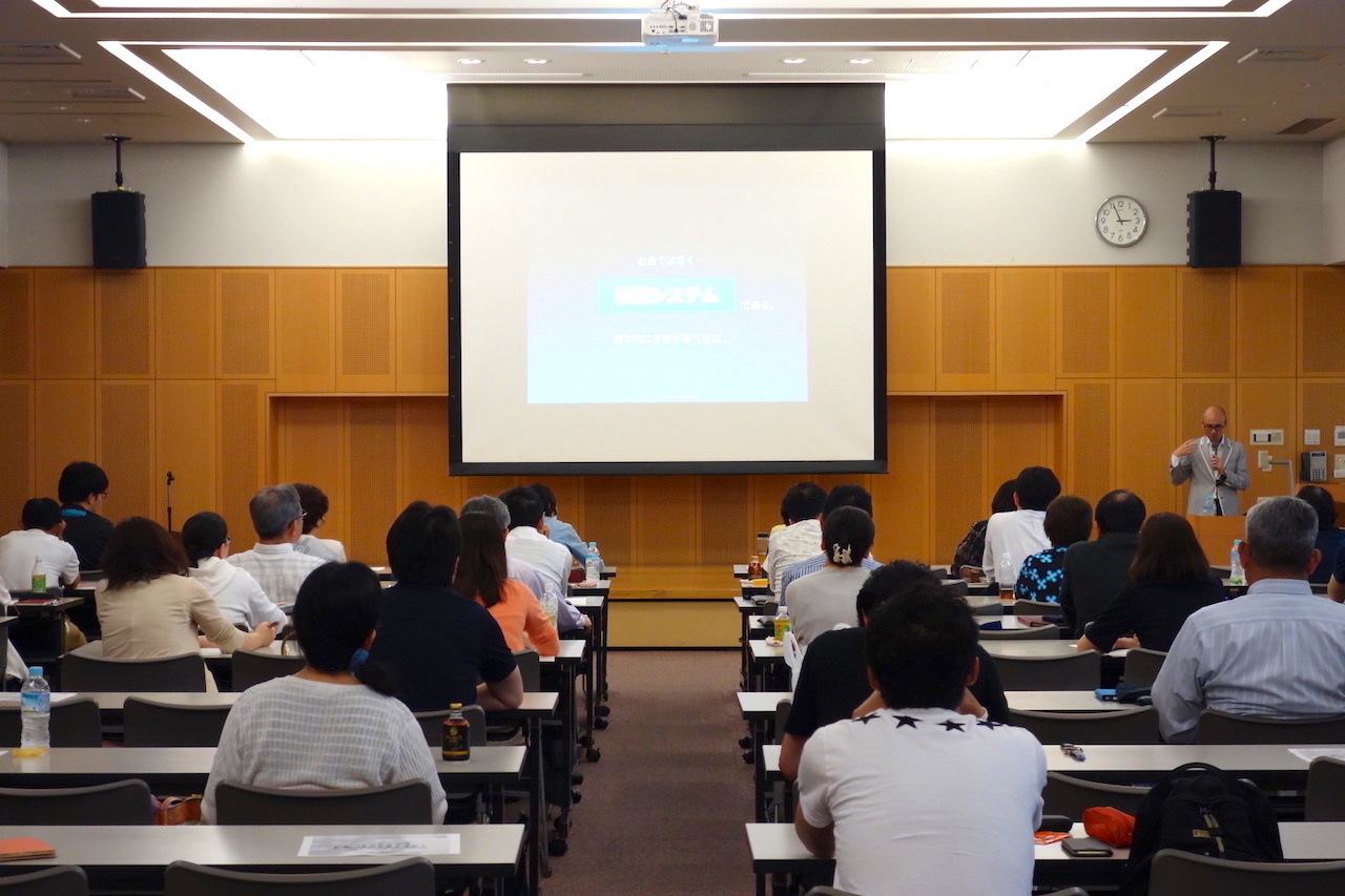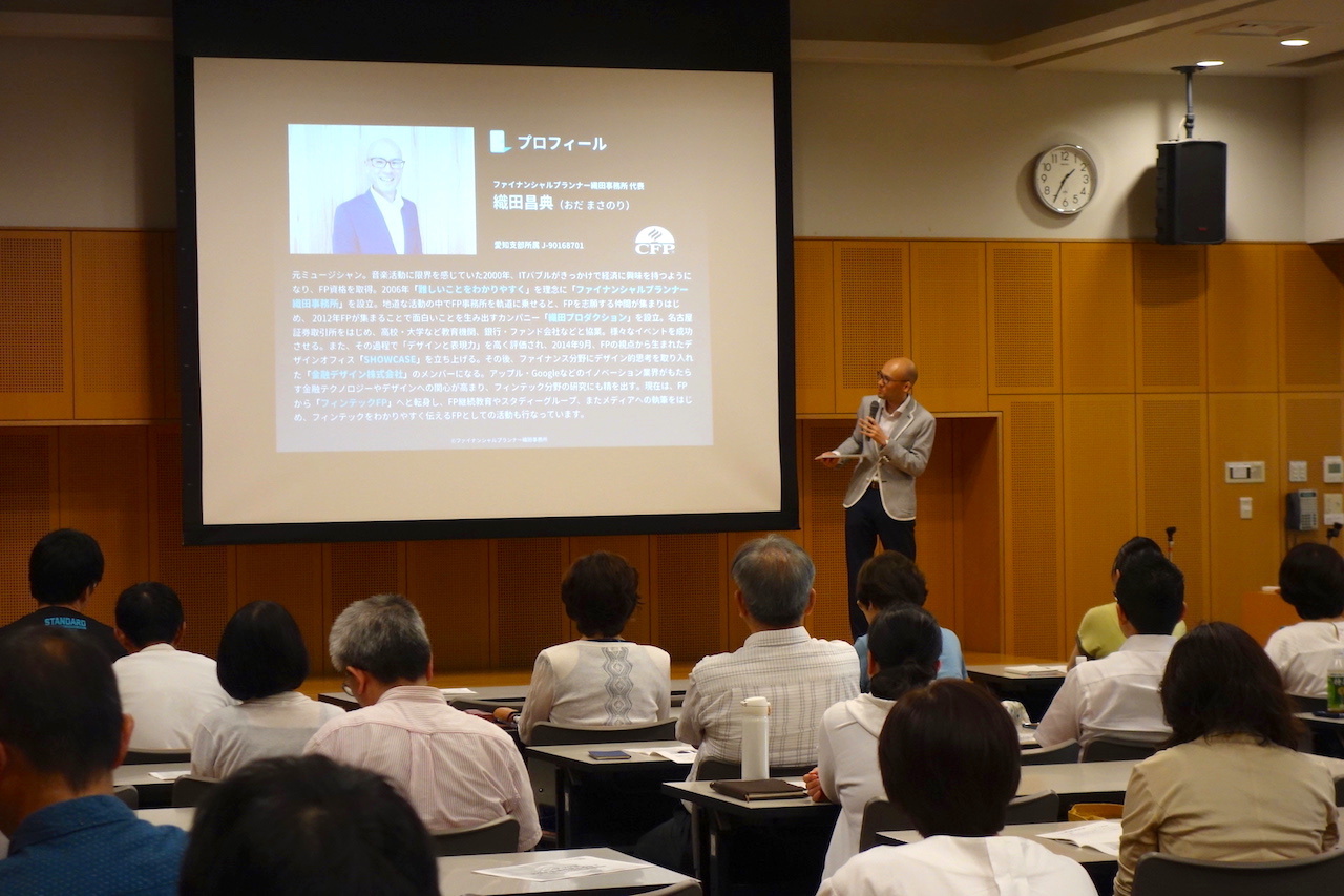 会場がまたかっこいいところでした。前面のフルスクリーンに加えて、後方にも 2枚のスクリーンという豪華な設備。普段の勉強会ではおおよそ 50名くらいと伺っていましたが、この日はなんと 75名ほどの参加者となり、大変な熱を帯びた開催となりました。今回もゆったり時間をとって、 3時間の研修会。 (金融3単位)
