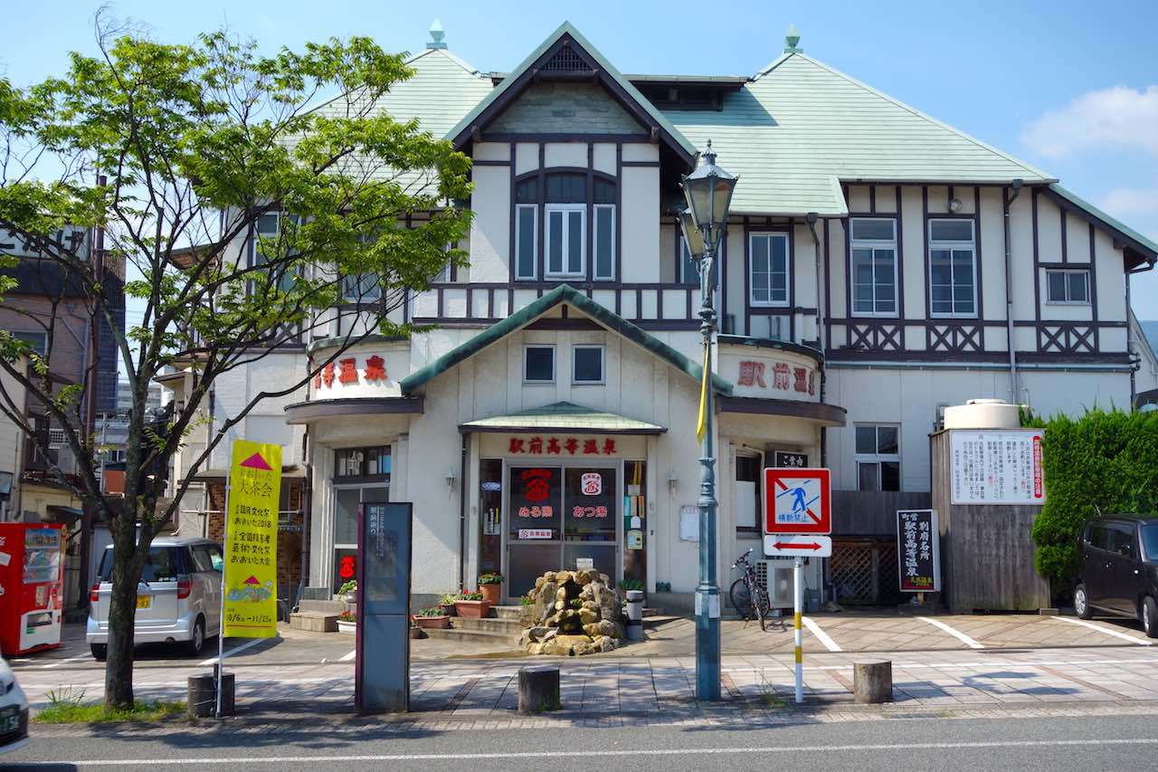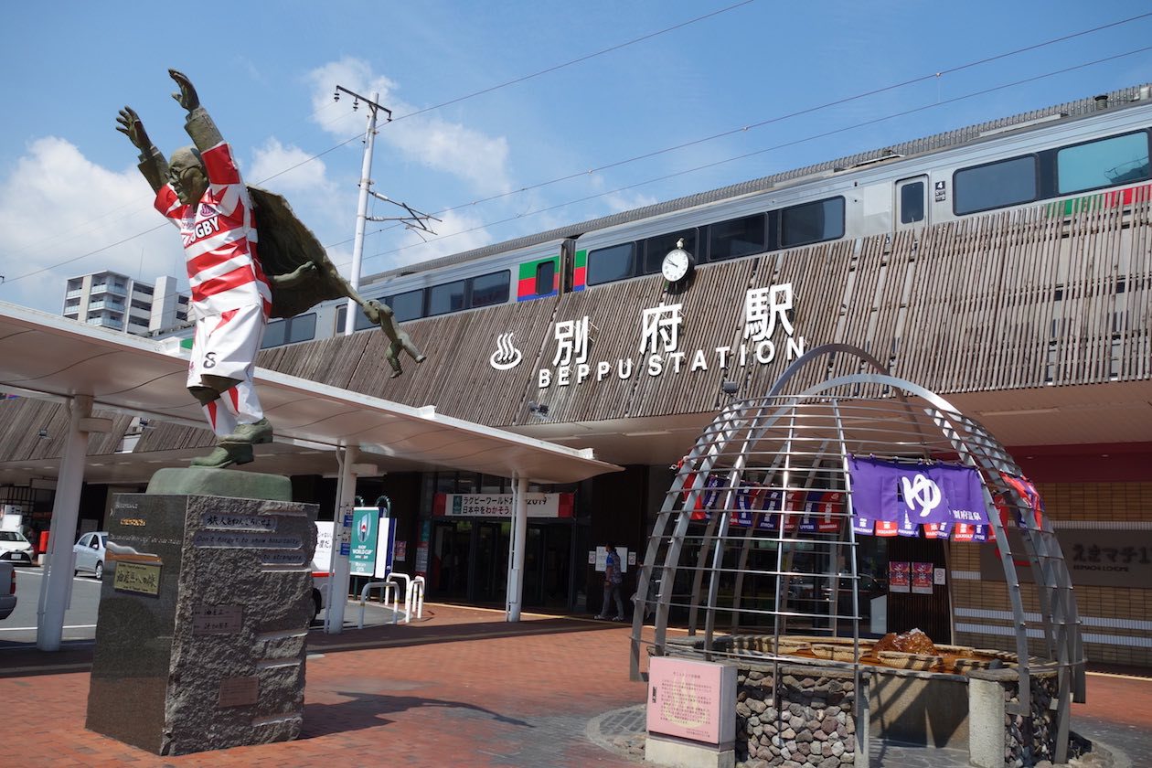 別府駅に到着。モニュメントとして別府の地を作ったとされる有名な油屋熊八さんの銅像が立っていました。脇には「手湯」が湧いています。