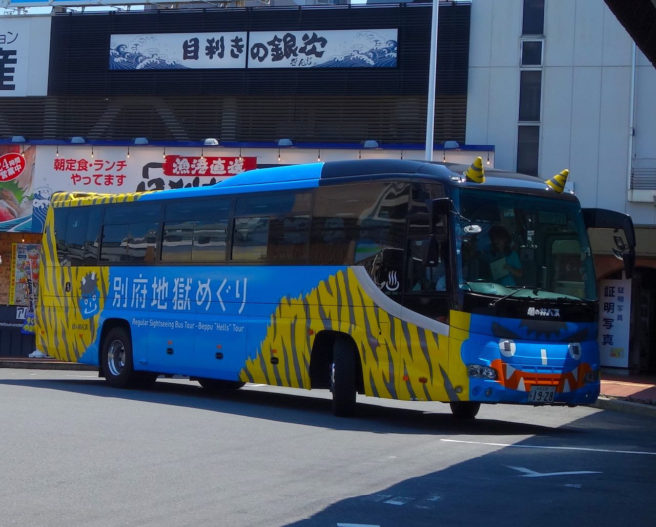 このかわいいバスでいきます(笑)実は、この亀の井バスが全国で初めて「女性バスガイド」をはじめたそうです。バスガイドさんがまたキュートで話が面白かった!別府のことをたくさん教えてくれます。あっという間に30分弱で到着します。全部で7箇所まわりました。