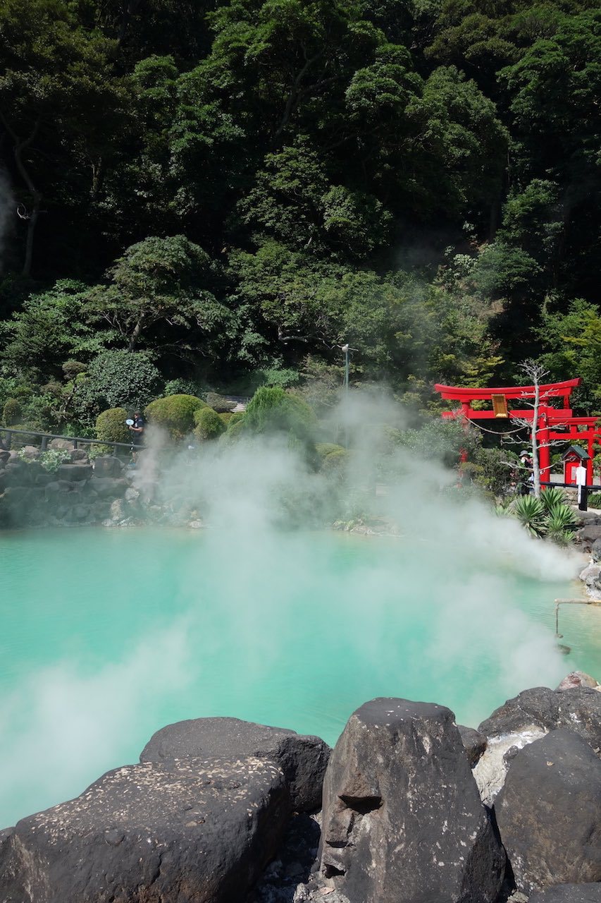「海地獄」と名付けられた温泉。まるで沖縄の海のように綺麗です。温度は約98度。