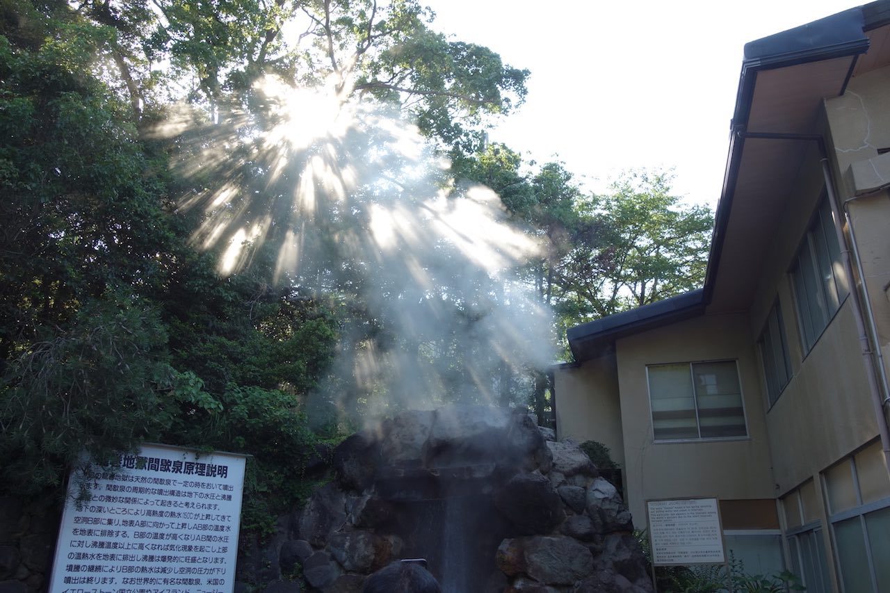 放出時の湯けむりによって、木の葉の隙間からの太陽光が放射線状になって綺麗に見えました!神がかっていました。